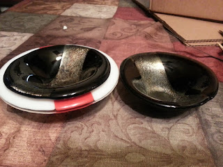 I will say, they do look pretty! Unfortunately it ended in complete failure. The blanks looked very pretty, the gold really comes out after fusing, as shown below. I don't normally crash cool, and as such it can take a lot of hours for a blank to cool down. Because I wanted to slump this right away, once the blank was 250-300° or so, I took it out and put it under hot water, which I then slowly changed to cool water, bringing it to room temperature in about a minute. I've done this several times with success. This time, however, I think the plate was hotter than the temperature on the kiln let on; as soon as it hit the hot water a significant crack appeared, between the color and clear layers: